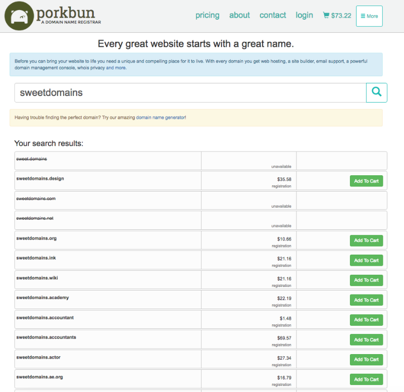 Porkbun also provides users with an impressive array of domain extensions. In addition to the standard .com, .net, and .org extensions, they offer a comprehensive selection of new top level domains (TLDs), providing a wide range of options to their customers.