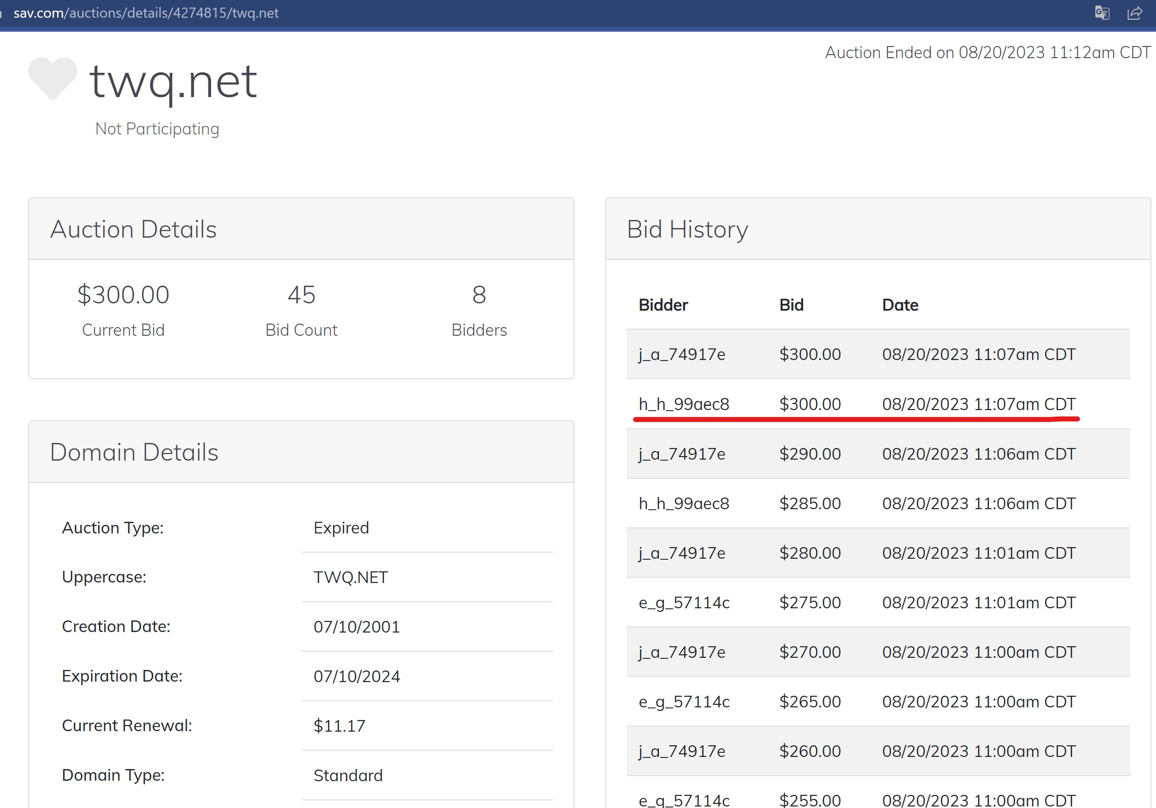 I was the first bidder at $300, but Sav said that I bid later and the person won the auction at $300 at 10:59 AM. I don't understand where they got that data from, as their website shows that I was the earliest bidder. I genuinely placed a bid of $300 first, and unbelievable that a company engages in such deceptive business practices. It's really disappointing